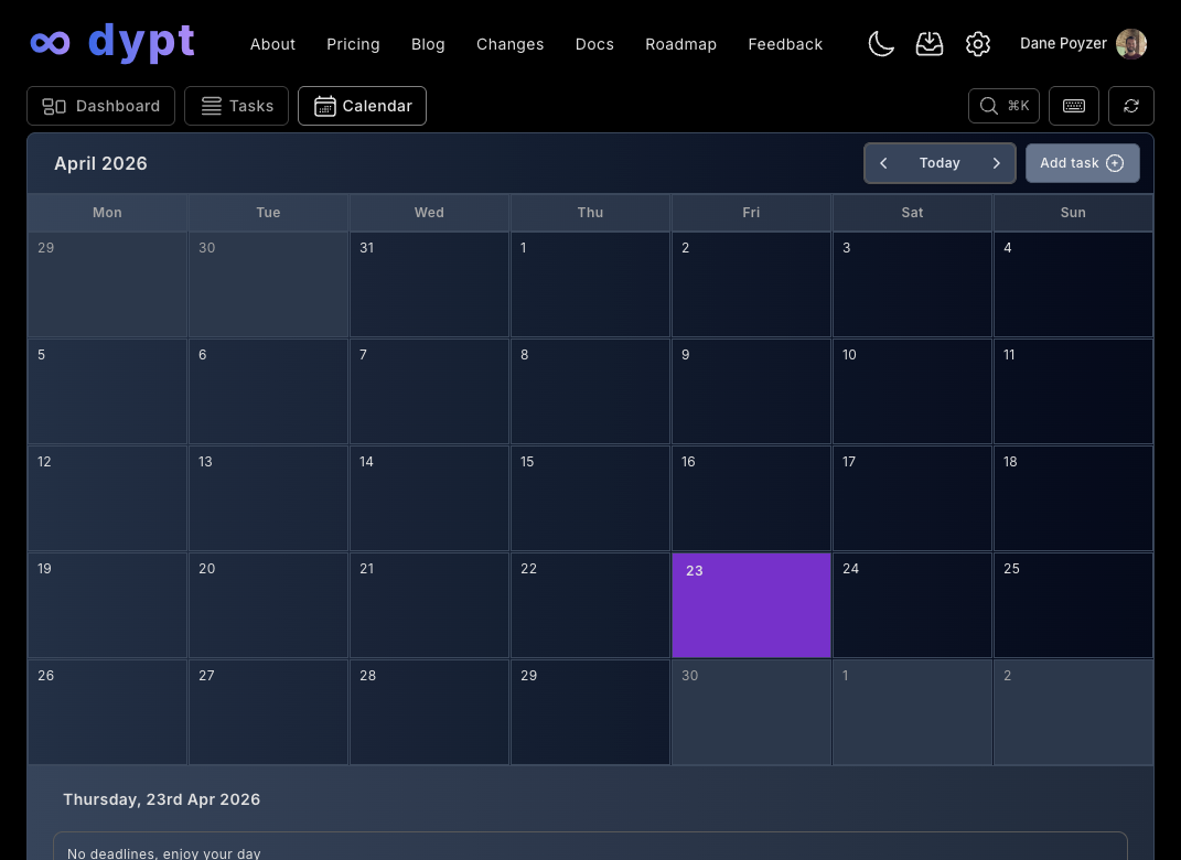 Let's take a look at the dypt app layout and how to navigate around. It's where you can create tasks, view your dashboard, plan from your calendar, manage settings and generally stay on top of your tasks.