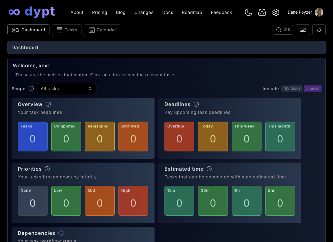Click the dypt logo, home icon, or press the "h" key, provided you aren’t editing a task.