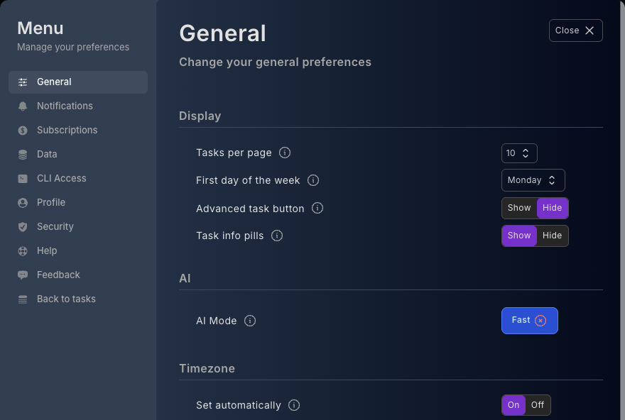 Settings is where you manage account details, preferences, notifications, your plan, data import/export, CLI access, help, guides and docs links.
