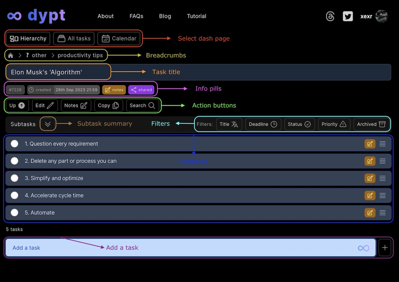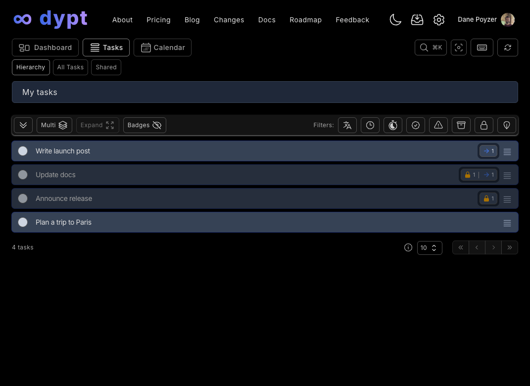 Your tasks in dypt are organised into a hierarchy; whereby any task can have subtasks. This allows you to break down large tasks into smaller, more manageable tasks.