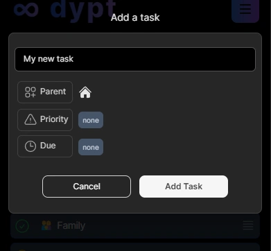 - "+ (square)" opens a dialog that allows you to add the task and preset certain properties such as the parent task, deadline and priority (kb: ctrl + enter)