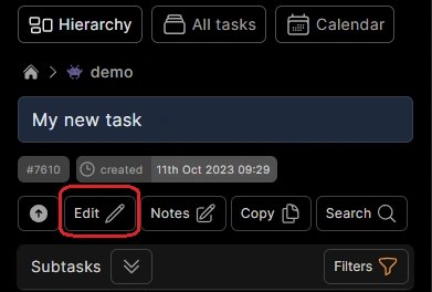 If you are on the tasks page, click the tasks title or the Edit button above the subtasks header. If the task is a subtask of the current task, click the menu icon at the right of the task & select Edit.