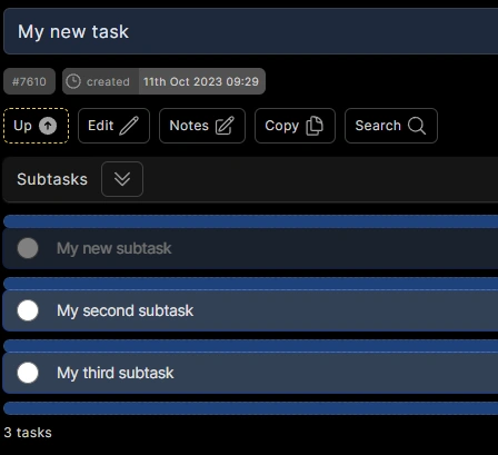 Click on the task or press the → key when you have a task selected. You will be taken to that task’s page where you can add as many subtasks to it as you like. You can even add subtasks to subtasks.
