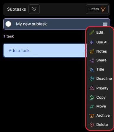When viewing subtasks, you can quickly edit a task’s title by clicking on the menu and selecting "Edit title" or by pressing the "e" key.